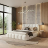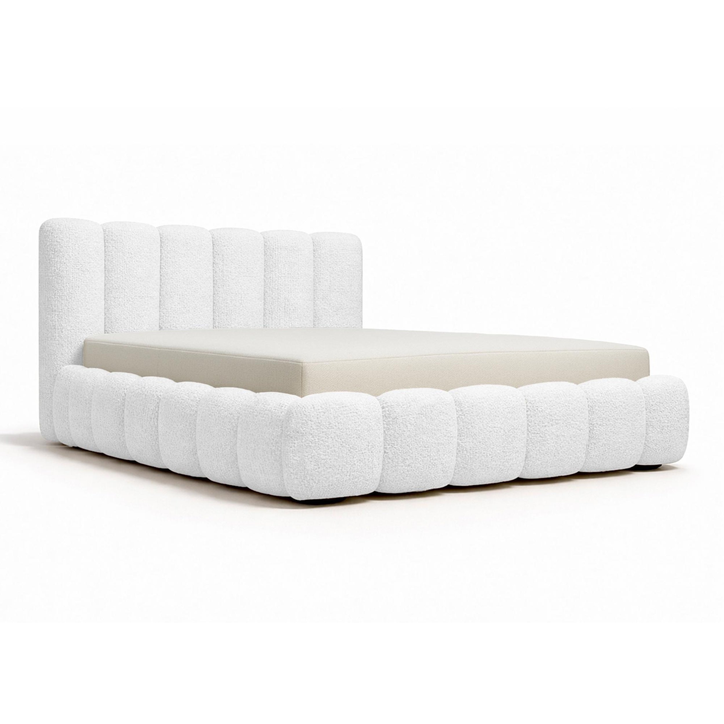 Łóżko Tapicerowane 160×200 Bari kolor biały to propozycja dla osób, które cenią połączenie elegancji, funkcjonalności oraz modnego designu. Już na pierwszy rzut oka zachwyca miękką linią oraz efektowną tkaniną bouclé (baranek), która nadaje wnętrzu przytulny, a jednocześnie luksusowy charakter. Co więcej, jego obłe kształty doskonale wpisują się w aktualne trendy wnętrzarskie, dlatego model Bari świetnie sprawdzi się zarówno w nowoczesnej, jak i w minimalistycznej sypialni.