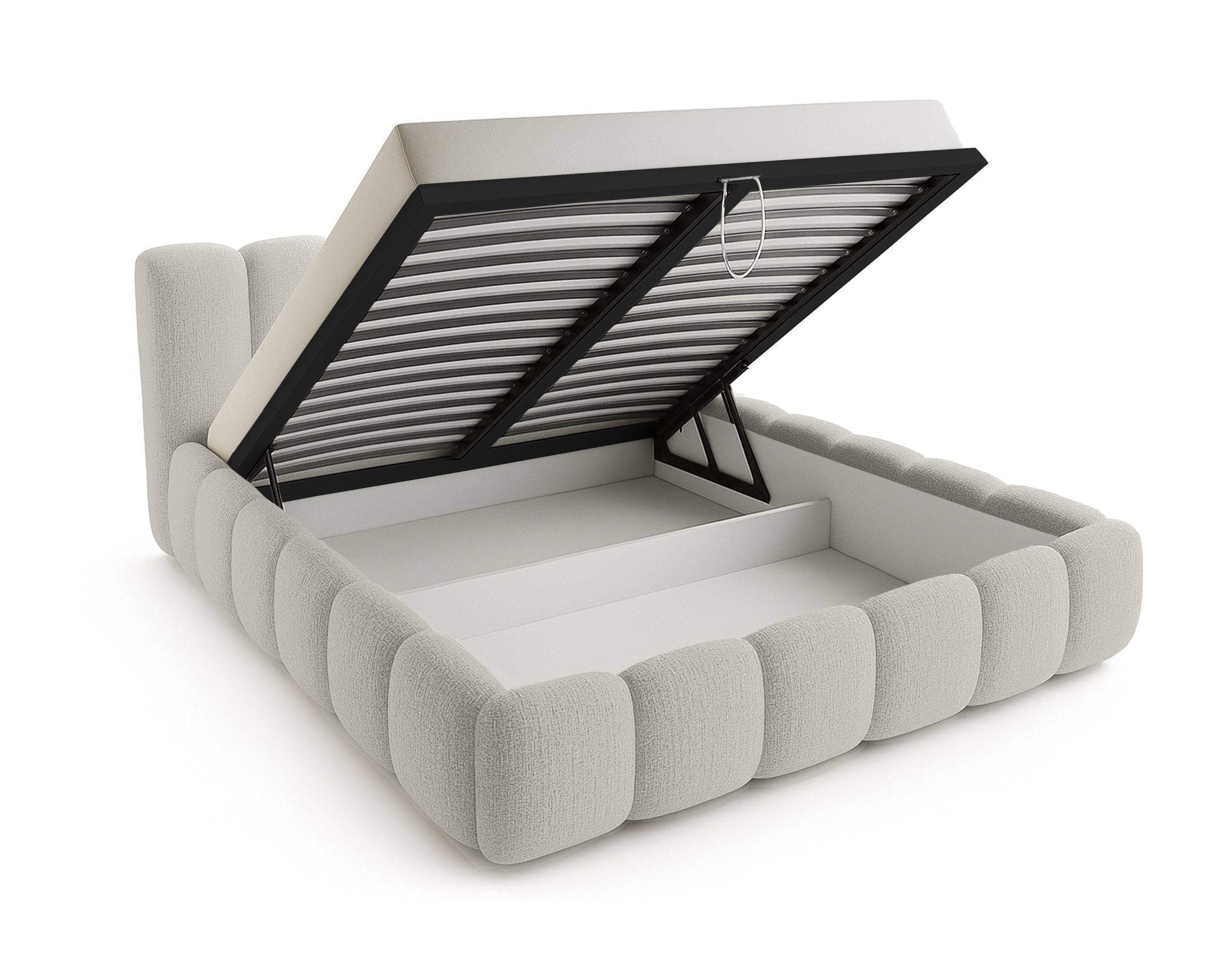 Pod materacem znajduje się duży pojemnik na pościel, który zwiększa funkcjonalność łóżka i ułatwia utrzymanie porządku. Możesz w nim wygodnie przechowywać kołdry, poduszki, koce czy sezonową pościel. Co więcej, dzięki solidnym siłownikom gazowym, otwieranie stelaża przebiega płynnie i bez wysiłku. W rezultacie łóżko MERANO pozwala zaoszczędzić miejsce w szafie, a także ułatwia organizację przestrzeni w sypialni.