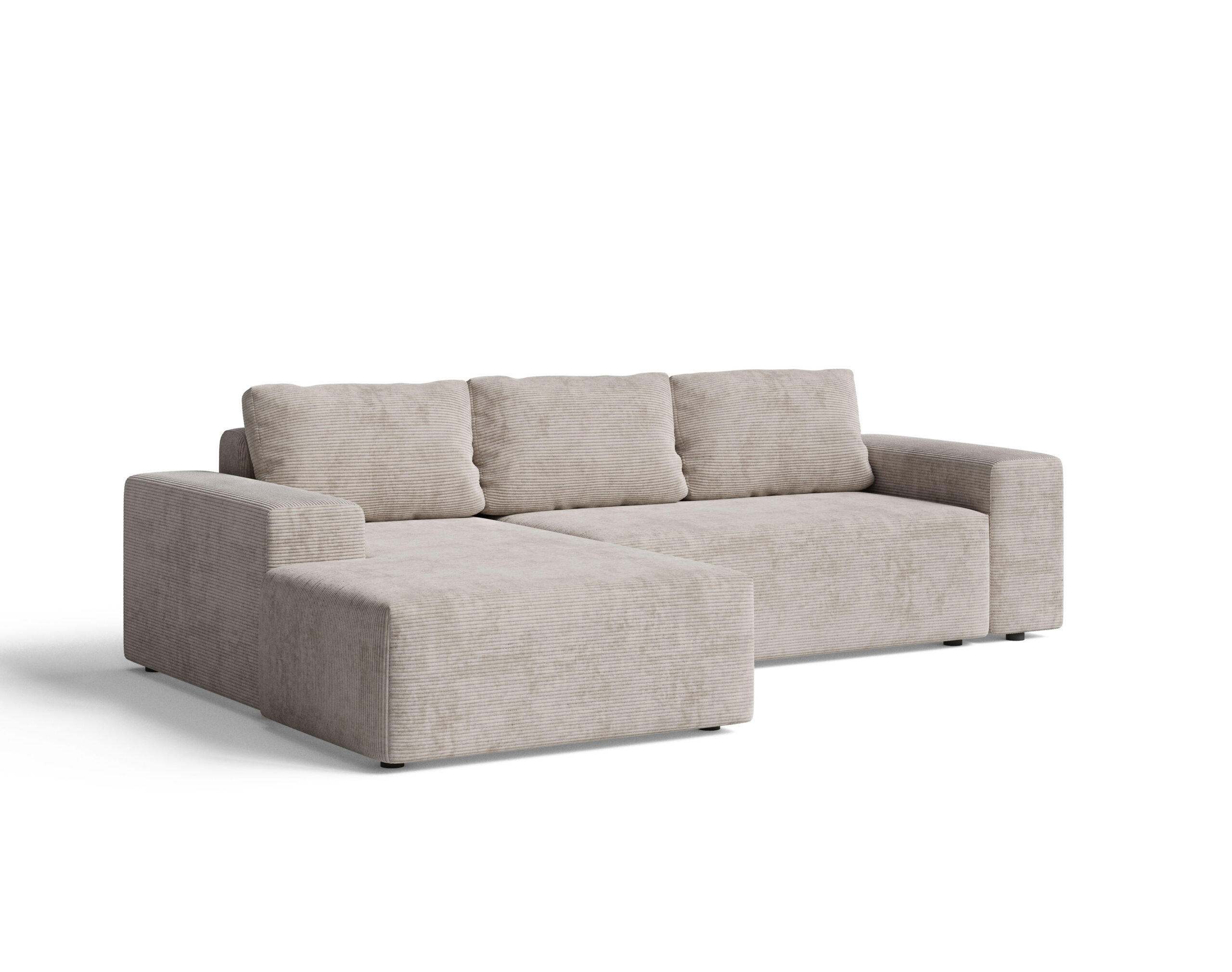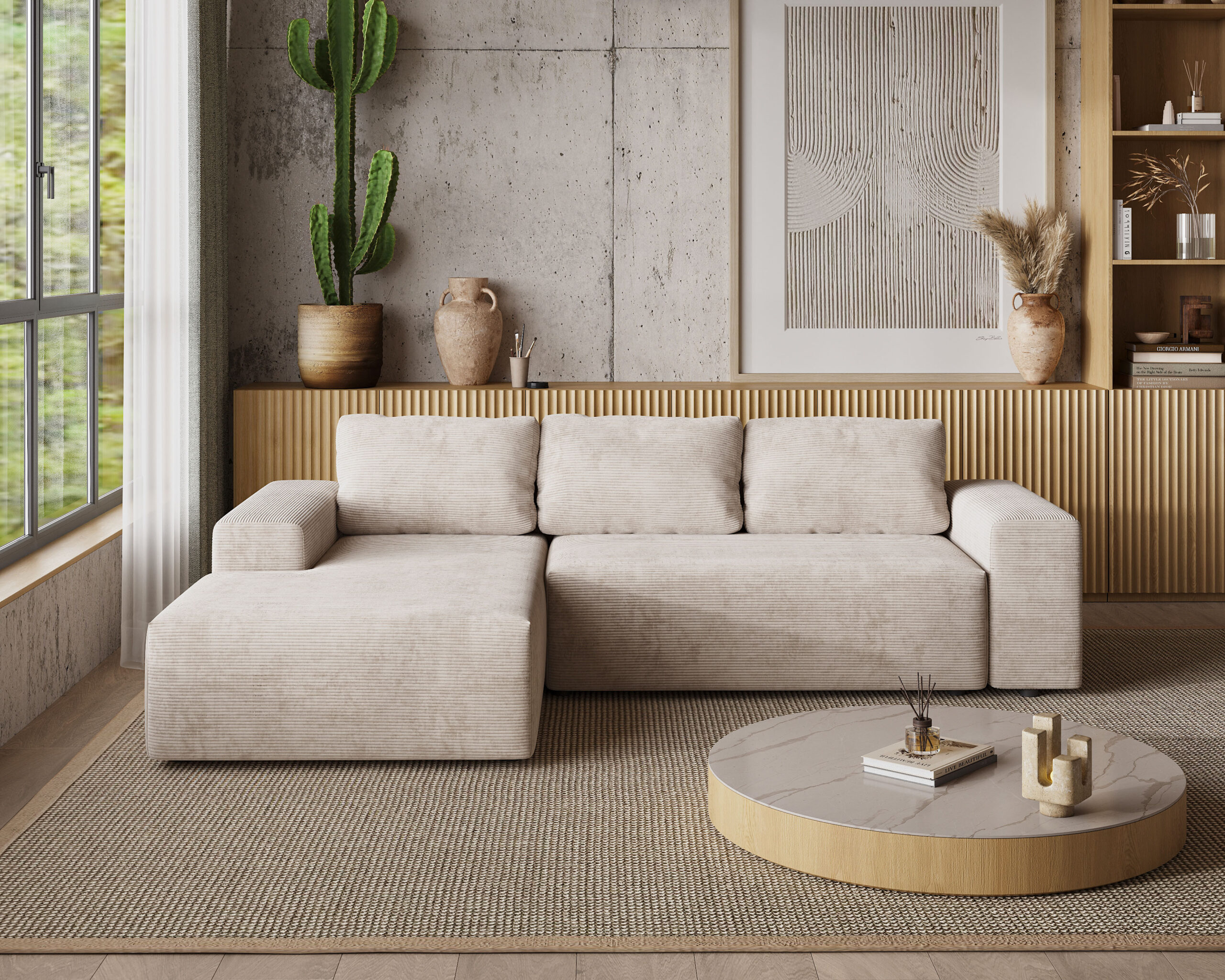 Dzięki neutralnej kolorystyce narożnik doskonale współgra z różnorodnymi dodatkami – od pastelowych, przez naturalne drewno, aż po kontrastowe, intensywne barwy. To mebel, który można łatwo dostosować do zmieniających się trendów, wystarczy zmienić poduszki dekoracyjne czy dywan, aby całkowicie odmienić charakter salonu.