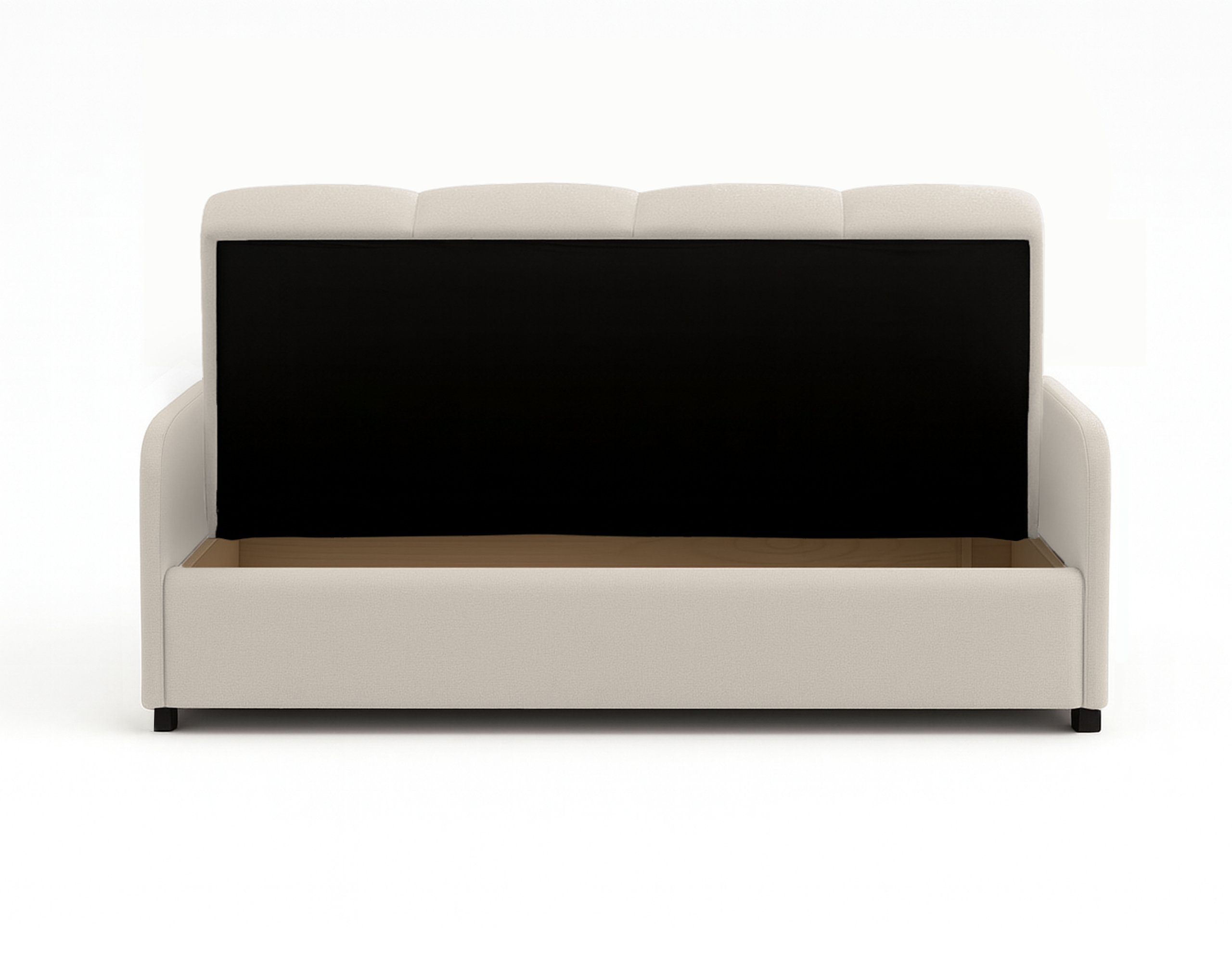 Jednym z największych atutów wersalki LAVIO jest pojemnik na pościel, umieszczony pod siedziskiem. To niezwykle praktyczne rozwiązanie, które pozwala na łatwe przechowywanie kołder, poduszek lub koców, utrzymując w salonie porządek i oszczędzając miejsce w szafie. Pojemnik jest solidny, wygodny w obsłudze i łatwo dostępny – wystarczy unieść siedzisko, aby zyskać dodatkową przestrzeń na tekstylia.